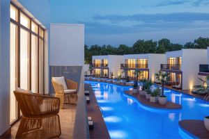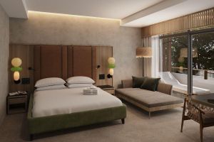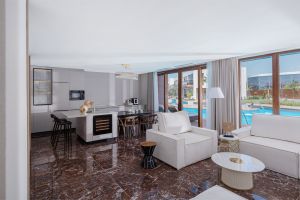 • Стильный дизайн и вид на бассейн будут сопровождать ваш незабываемый отдых в 7 уютных двухкомнатных номерах категории Suite Deluxe Pool View. Номера расположены на 2 и 3 этажах основного здания отеля. Каждый номер с отдельными спальней и гостиной, двумя балкона с комфортной плетеной мебелью и шезлонгом. В гостиной предусмотрены рабочее место, зона отдыха, мини - кухня и обеденная зона.