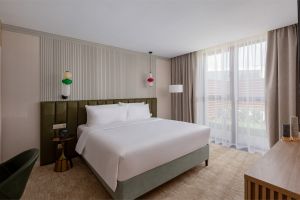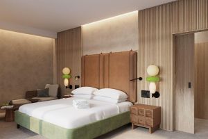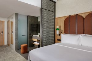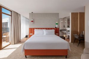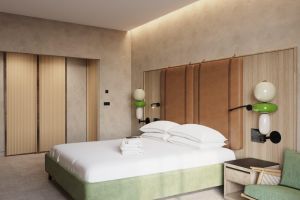 • Стильный и современный номер с дизайнерской отделкой спроектирован специально для ценителей роскошного отдыха. Ощутите всю прелесть домашнего уюта в просторном номере с панорамным видом на внутренний двор отеля. Здесь есть все для вашего комфорта – двуспальная кровать, диван, телевизор, современная ванная комната.