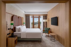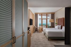 Уютный стильный номер, оснащенный балконом, с которого открывается впечатляющий вид на бассейн и море. Здесь всё создано для комфорта наших гостей: стильная мебель, интересные дизайнерские решения, современная техника, полностью оборудованная ванная комната, а также балкон с плетеной мебелью и шезлонгом. Вам не придётся ни о чём переживать, потому что в номерах категории Deluxe Twin Sea View есть всё, что нужно для роскошного отдыха.