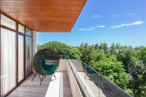 Балкон с плетеной мебелью и шезлонгом – идеальное место для принятия солнечных ванн или позднего завтрака.