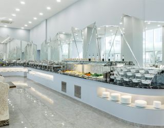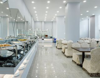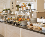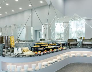 В приятно оформленном ресторане предложена система «шведского стола». Каждый гость может выбрать блюда по собственному вкусу, регулируя объем и сочетание компонентов индивидуально