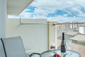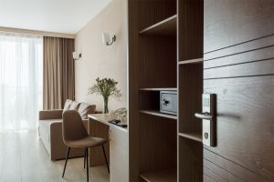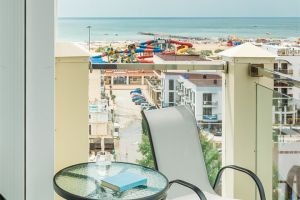 Двухкомнатный номер с двумя балконами (S номера 40 м2, S 1 балкона 11,5 м2) и сан.узел. Вид на море можно наблюдать с двух балконов. В качестве основных мест предоставляется двуспальная кровать. В качестве дополнительных мест предоставляются 2х местный раскладной диван (два дополнительных места) и раскладное кресло (одно дополнительное место). В номере есть: холодильник, TV, сплит-систем, сейф, чайник, фен, посуда, чай/кофе/сахар, кофемашина с капсулами, питьевая вода 0,5л, халаты детские и взрослые, банные принадлежности и гостиничная парфюмерия. Номера расположены с 5 по 9 этажи. Шампанское при заезде.
