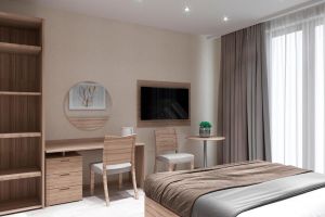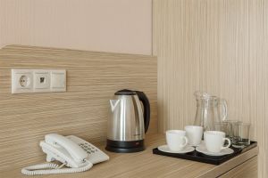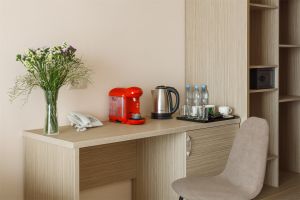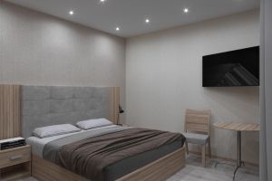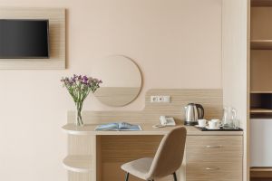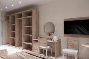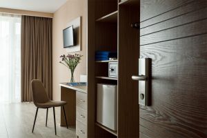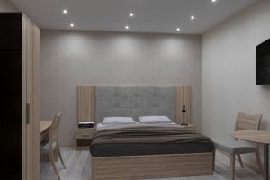 • Однокомнатный номер с балконом (S номера 28 м2, S балкона 6 м2). В номере одна двуспальная кровать и одна односпальная. В качестве дополнительного места может быть предоставлена еврораскладушка. Имеется: холодильник, TV, сплит-система, ванная комната, балкон, сейф, чайник, фен, посуда, чай/кофе/сахар (ежедневная выкладка), питьевая вода 0,5л, банные принадлежности и гостиничная парфюмерия (разово при заезде).Номера расположены с 5 по 9 этажи.