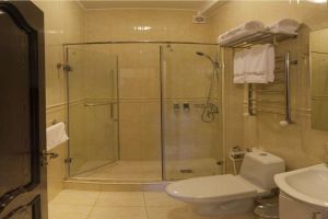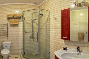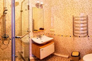 • увеличенный санузел отделан кафельной плиткой в мягких тонах и оборудован душевой кабиной. Гостям предоставляются в пользование халаты, тапочки, полотенца, фен, наборы средств гигиены.