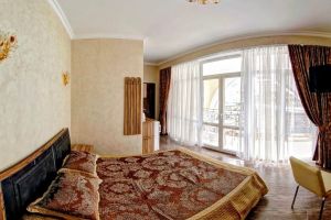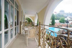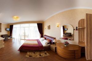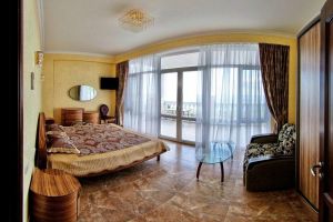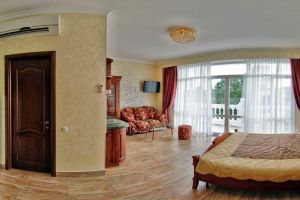 Люкс Студия представляет собой студийный вариант комнаты в Крыму с выходом на балкон, откуда открывается красивый вид на бассейн и террасу, на Голубой залив и гору Кошку.