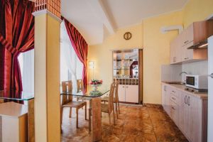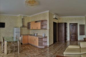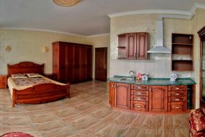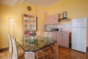 • Однокомнатные апартаменты примечательны тем, что имеют отдельную кухню. Она оборудована электрическим чайником, электрической плитой, холодильником и необходимым минимумом посуды