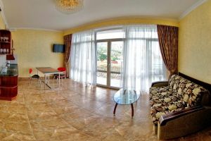 • Люкс Студия представляет собой студийный вариант комнаты в Крыму с выходом на балкон, откуда открывается красивый вид на бассейн и террасу, на Голубой залив и гору Кошку.