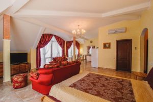 Номер Пентхаус имеет большую гостевую комнату, уютную спальню, туалетную комнату и 2 санузла. Каждая комната оснащена телевизором и имеет выходы на балконы с видом на внутренний дворик и Голубой залив моря.