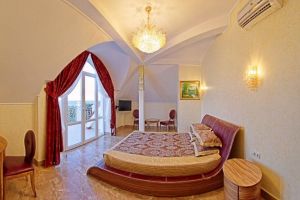 • Номер Пентхаус имеет большую гостевую комнату, уютную спальню, туалетную комнату и 2 санузла. Каждая комната оснащена телевизором и имеет выходы на балконы с видом на внутренний дворик и Голубой залив моря.