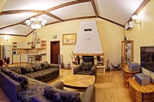 • зона отдыха с камином, большим диваном, кофейным столом и стереосистемой,