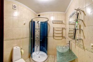 • светлый санузел оборудован душевой кабиной, унитазом, умывальником с большим зеркалом.