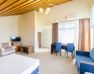 Плюсов много: месторасположение, территория, номер, пляж. Для отдыха с детьми одно удовольствие, на мой вкус. Еда санаторная, больше диетическая. Хотелось бы в еде разнообразия.