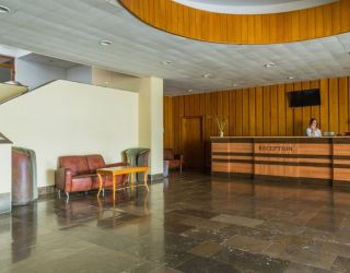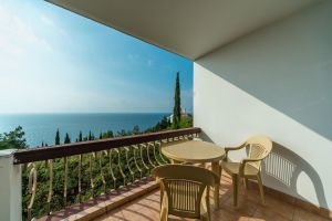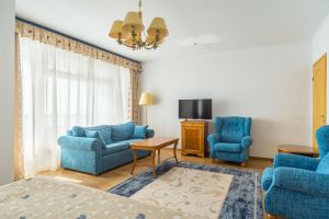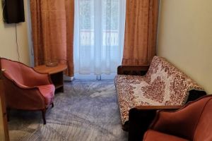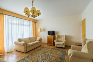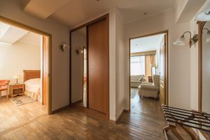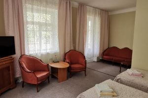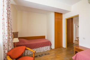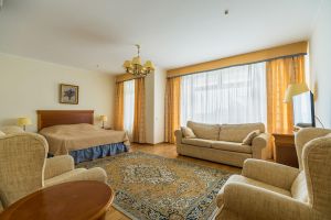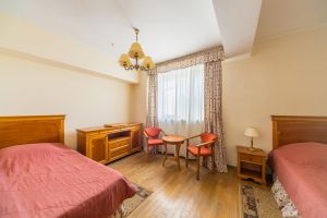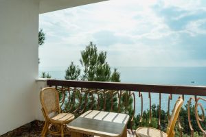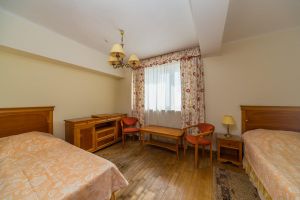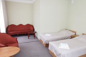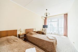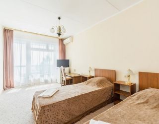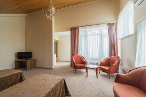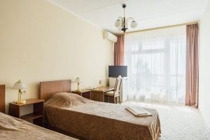 Двухкомнатный номер, имеющий просторный балкон, с которого открывается прекрасный вид на реликтовый парк, в номере есть две односпальные кровати с прикроватными тумбами, диван, два кресла, холодильник, санузел с душем, телевизор, кондиционер, сушилка, шкаф, сейф, предметы гостеприимства