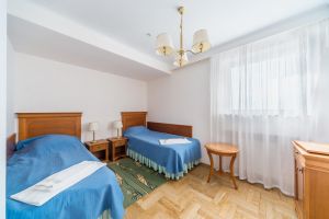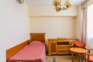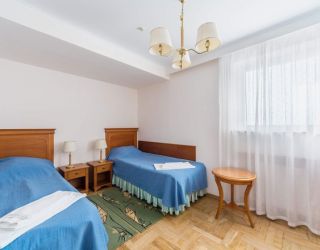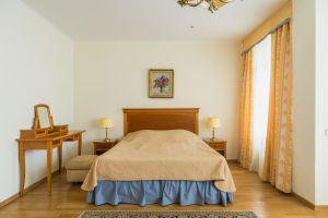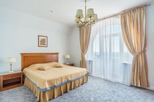 Просторный VIP номер, с евро ремонтом и балконом, имеющий одну спальню с гарнитуром (двуспальная удобная кровать с прикроватными тумбами и мягким уголком, журнальным столиком и комодом), одну детскую комнату (с двумя односпальными кроватями).