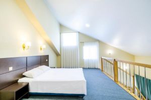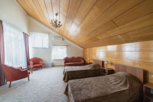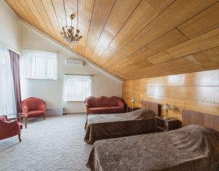 Однокомнатный номер мансардного типа с евро ремонтом и балконом, имеющий две односпальные кровати с прикроватными тумбами, мягкий уголок (диван и два кресла), столик и стулья, шкаф-купе, санузел с душевой кабиной, телевизор, сейф...