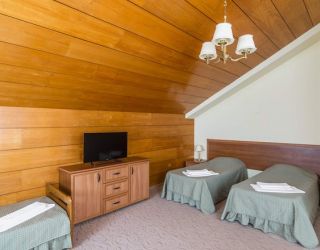 Однокомнатный номер мансардного типа с балконом, имеющий три односпальные кровати с прикроватными тумбами, мягкий уголок (диван и два кресла), столик и стулья, шкаф-купе, санузел с душевой кабиной, телевизор, холодильник, сушилка, сейф...