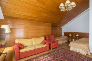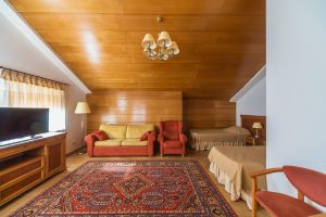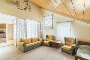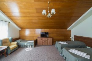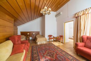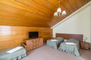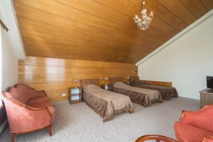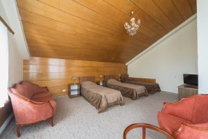 Однокомнатный номер мансардного типа с балконом, имеющий три односпальные кровати с прикроватными тумбами, мягкий уголок (диван и два кресла), столик и стулья, встроенный платяной шкаф, санузел с душем, телевизор, холодильник, сушилка, сейф...