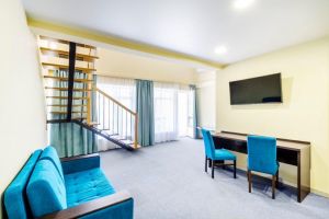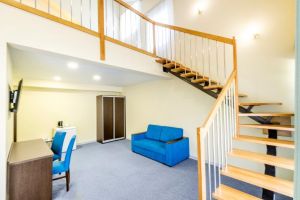 Однокомнатный номер в двух уровнях; на первом уровне расположена гостиная, на втором уровне расположена спальня, соединенная лестницей внутри номера с первым уровнем.