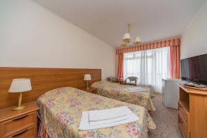 Однокомнатный номер с балконом, имеющий две односпальные кровати с прикроватными тумбами, встроенный платяной шкаф, санузел с душем, телевизор, холодильник, сушилка, сейф, предоставляются банные и пляжные полотенца, бельё.