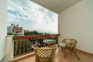 Однокомнатный номер мансардного типа с евро ремонтом и балконом, имеющий две односпальные кровати с прикроватными тумбами, мягкий уголок (диван и два кресла), столик и стулья, шкаф-купе, санузел с душевой кабиной, телевизор, сейф, холодильник, сушилка, предоставляются банные и пляжные полотенца, бельё.