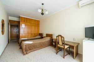 Однокомнатный номер с балконом и евро ремонтом, имеющий две односпальные кровати с прикроватными тумбами, столик и стулья, шкаф-купе, санузел с душевой кабиной, телевизор, холодильник, сушилка, сейф, предоставляются банные и пляжные полотенца.