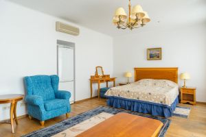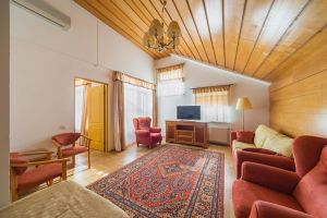 Уютные VIP апартаменты, расположенные в здании исторической усадьбы XX века, с прекрасным видом на восточную сторону и море. В номере имеется двуспальная кровать с прикроватными тумбами и туалетным столиком, одна односпальная кровать и раскладной диван, телевизор, кресла, раскладной диван, сейф, кухня...