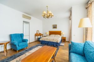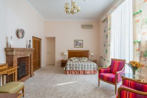 VIP номер с камином и балконом, расположенные в здании исторической усадьбы XX века, с прекрасным видом на парковую зону и море, в номере одна просторная комната с двуспальной кроватью и прикроватными тумбами, телевизор, холодильник, 4 кондиционера, журнальный и кофейный столики, кресла, большая ванная комната, фен, сейф.
